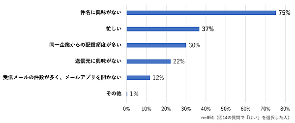 逆に「送られてくるメールマガジンを読まない(開封しない)ことはありますか」は76%が「はい」と回答。「メールマガジンを読まない理由」を聞くと、「件名に興味がない」75%が特に多く、「忙しい」37%がそれに続いた。
