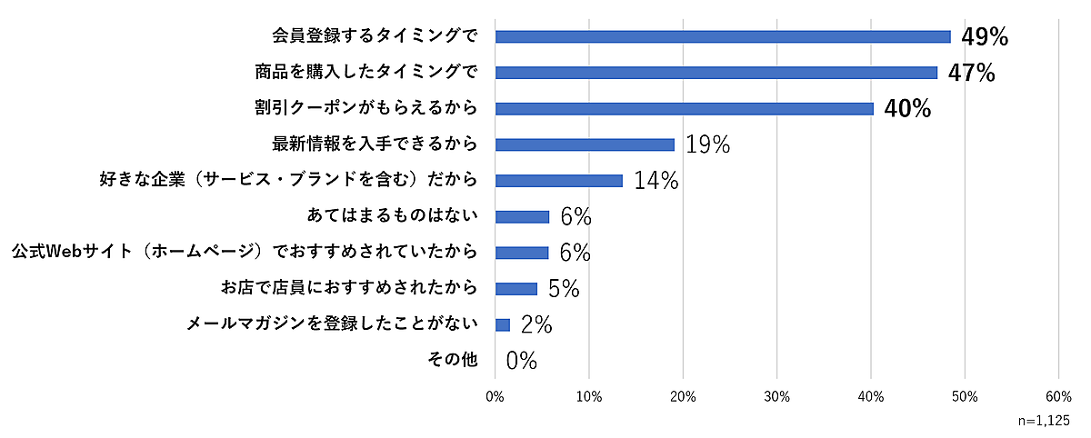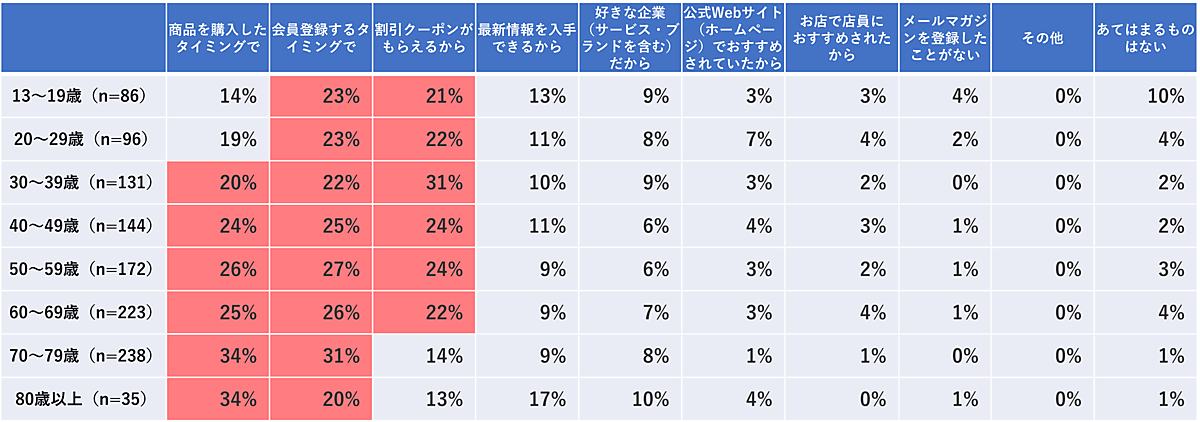 メールマガジンを登録するきっかけでは「会員登録するタイミングで」49%、「商品を購入したタイミングで」47%が上位。「割引クーポンがもらえるから」40%がそれに続く。年代別で見ると、「商品を購入したタイミングで」が高年齢ほど増える。