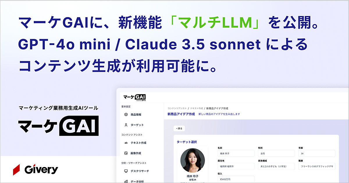 生成AI(人工知能)の法人活用推進・マーケティングDX(デジタル変革)支援サービス事業のギブリーは、同社が運営するマーケティング業務用生成AIツール「マーケGAI(マーケジーエーアイ)」で、任意の生成AIを選んでコンテンツ生成に利用できる機能「マルチLLM」の提供を9月13日に始めた、と同日発表した。LLMは大規模言語モデルの意。