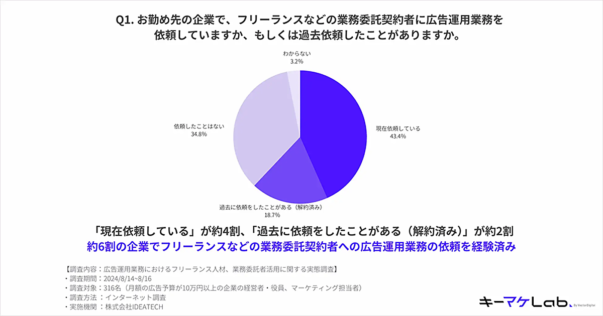 キーワードマーケティングが運営する「キーマケLab」は、「広告運用業務におけるフリーランス人材・業務委託者活用に関する実態調査」を実施した。月額広告予算が10万円以上の企業の経営者・役員、マーケティング担当者316名が回答している。