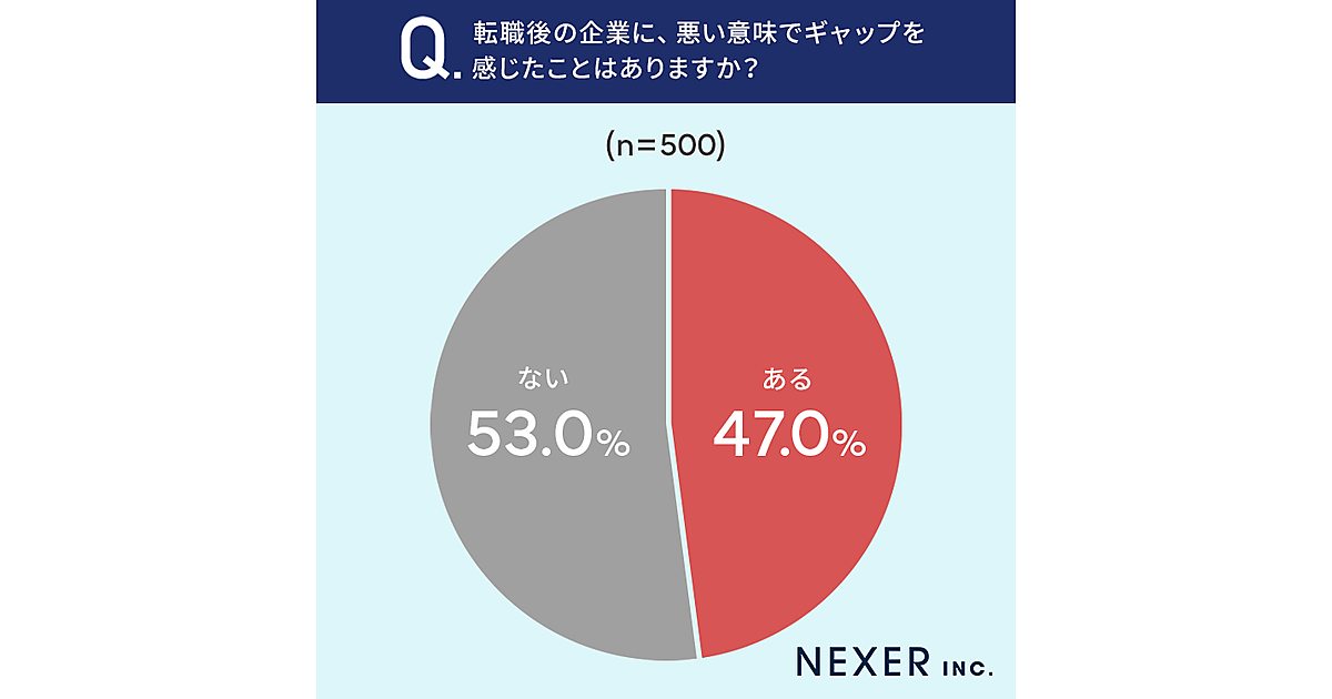 一方で、転職後の企業に悪い意味でのギャップを感じたことはあるかを聞くと、47.0%の人が「ある」と回答。自由回答では「残業や仕事量の多さ」「面接で聞いていた話と違った」などの声が多かった。