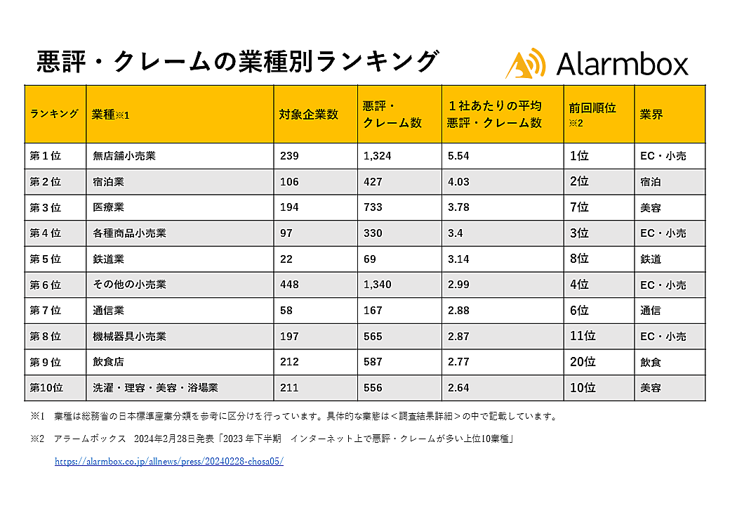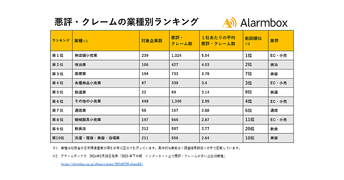 アラームボックスは、「インターネット上で悪評・クレームが多い上位10業種」について調査結果を発表した。2024年上半期においてネット投稿されたクチコミ・評判から悪評・クレームを抽出・集計している。10,750社が対象。