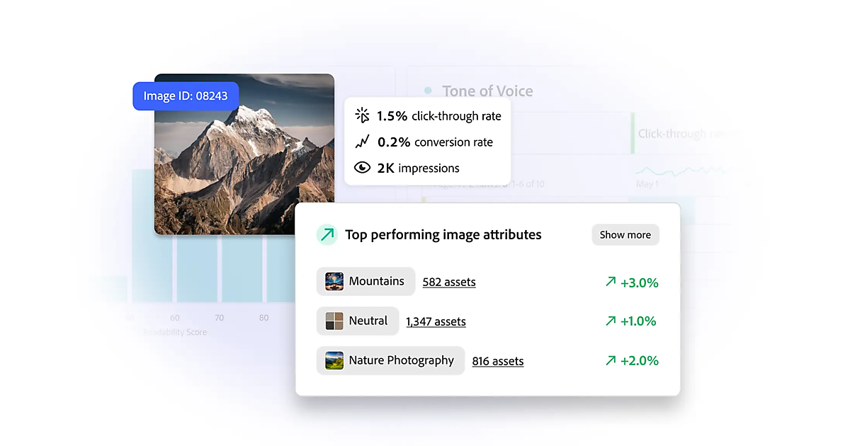 顧客体験のパーソナライズは、さまざまなチャネルや市場向けに数千のバリエーションが必要になる。例えば新しいホテルのプロモーション担当者は、山、緑地、都市景観などから、どのクリエイティブ要素が多くの予約をもたらすかのインサイトに基づいてWebコンテンツを最適化できる。企業ブランドに即したマーケティングアセットを自動生成し、言語、トーン、コンテンツタイプに基づいて特定のターゲット向けに最適化する。