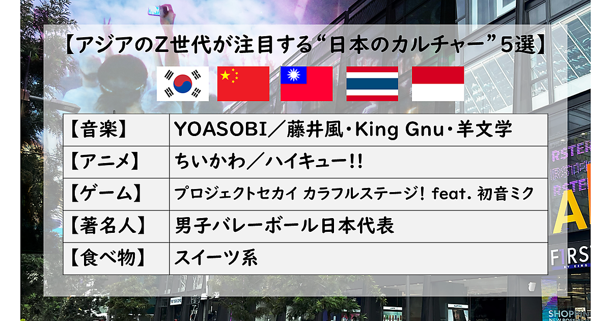 TNCは、「アジアのZ世代が注目する“日本のカルチャー”5選」に関する調査結果を発表した。音楽・アニメ・ゲーム・著名人・食べ物の5ジャンルについて、韓国・中国・台湾・タイ・インドネシアのアジア5地域主要都市でヒアリングを行っている。