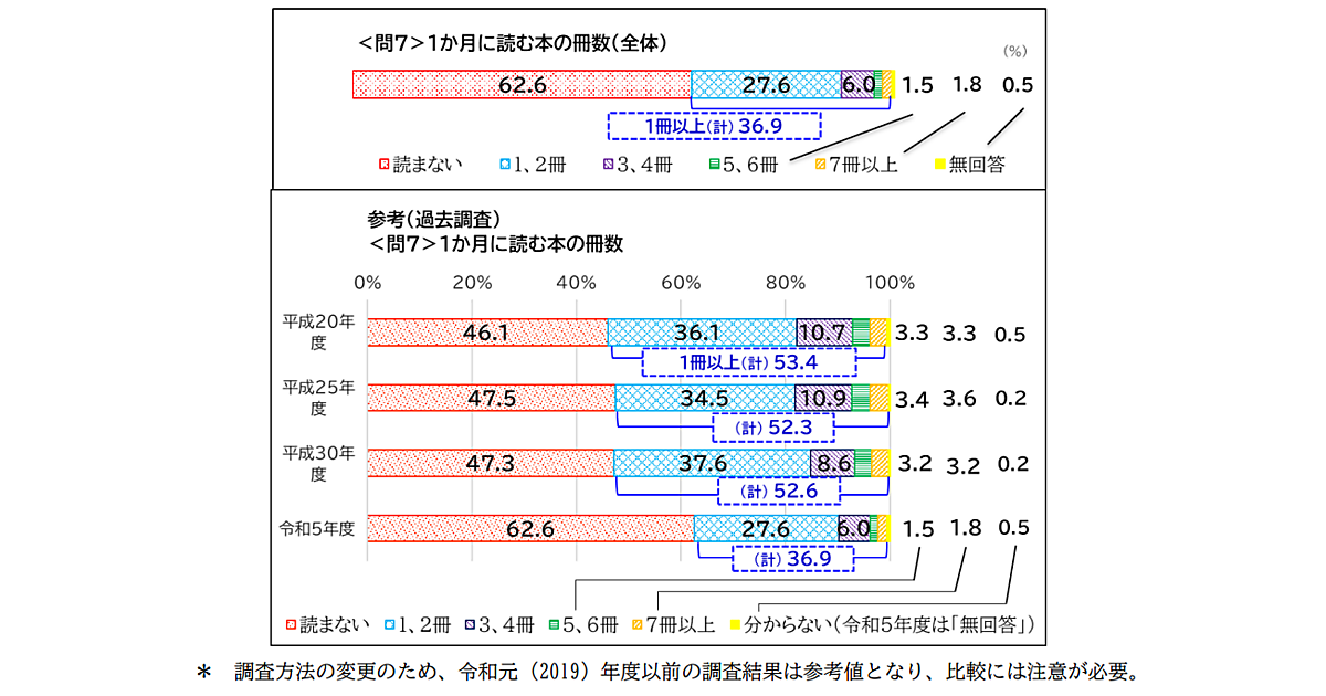 まず、1か月に読む本の冊数を聞いたところ、「読まない」が62.6%で最も多く、「1、2冊」が27.6%と続いた。過去の調査結果と比較すると、「読まない」の割合が約15ポイント増加している。