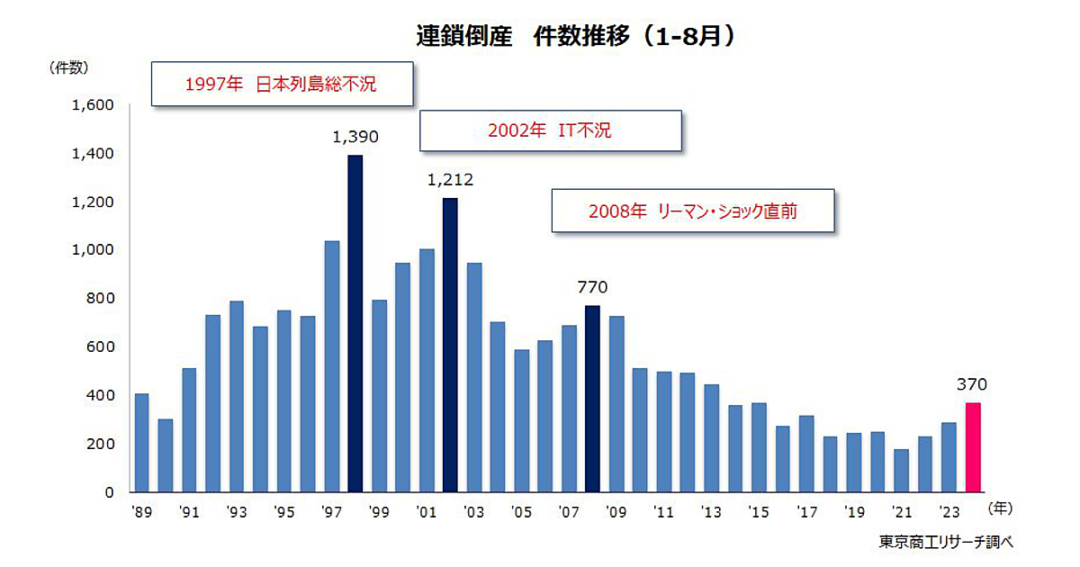 2024年1-8月の連鎖倒産は370件、右肩上がりで急増