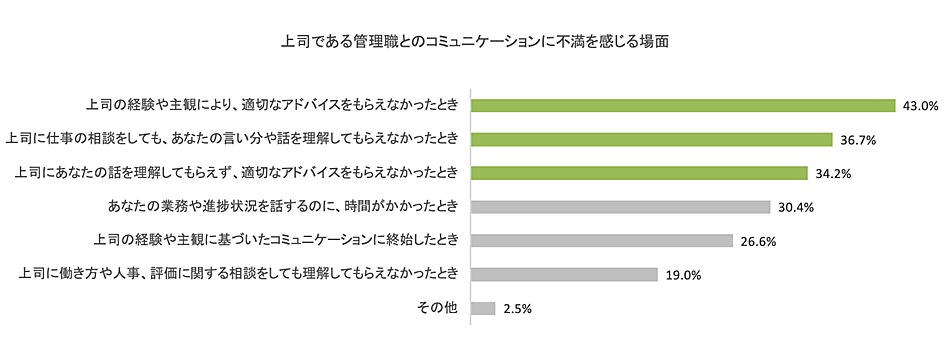 一方「管理職とのコミュニケーションで不満を感じる」と回答した人に聞くと、「上司の経験や主観により、適切なアドバイスをもらえなかったとき」43.0%、「上司に仕事の相談をしても、言い分や話を理解してもらえなかったとき」36.7%、「上司にあなたの話を理解してもらえず、適切なアドバイスをもらえなかったとき」34.2%が理由の上位あがった。