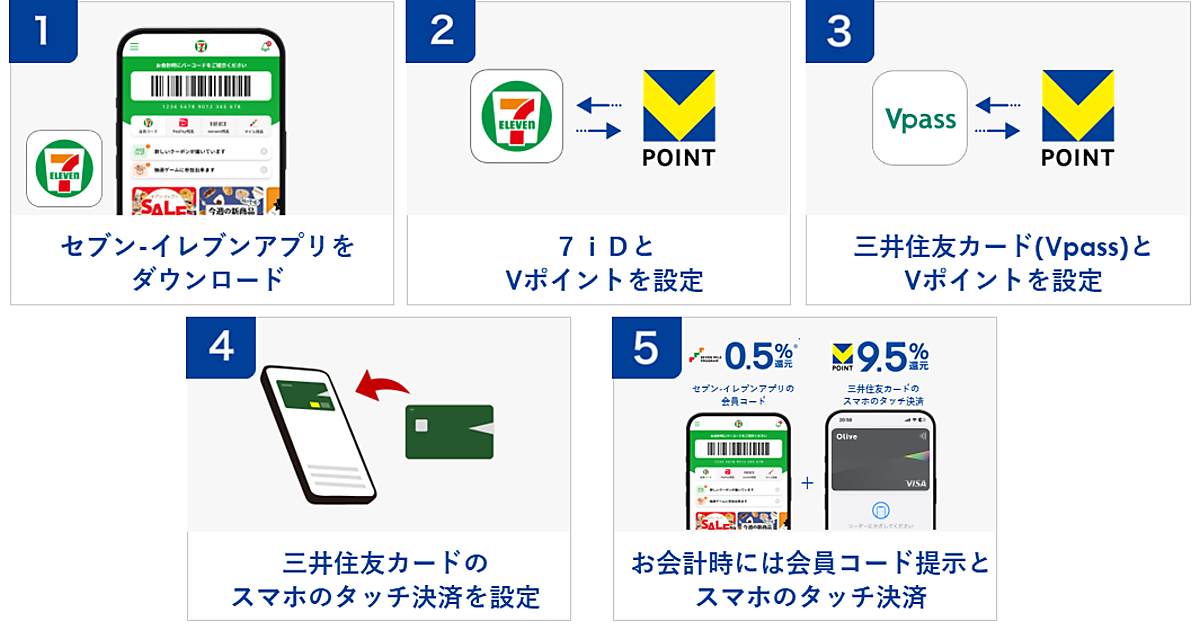 三井住友カードを持たないV会員も、Vポイントを毎週金曜日限定でセブン-イレブンでお得に使えるようにする。7iDとV会員番号をID連携し、「VポイントPayアプリ」とV会員番号のID連携を設定しておく。セブン-イレブンアプリの会員コードを提示してセブンマイルを貯めてVポイントへ交換することで、決済金額の0.5%のVポイントが貯まり、VポイントPayアプリのスマホのタッチ決済で9.5%がVポイントPay残高に還元される。