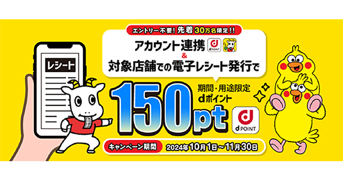 マーケティングソリューション領域の事業を拡大し、購買データを基に顧客行動理解を深めてマーケティングの高度化を目指す。協業開始を記念して10月1日から11月30日にdアカウントとスマートレシートを新規に連携して電子レシートを1回以上発行すると、先着30万名にdポイント(期間・用途限定)を150ポイント提供するキャンペーンを展開する。