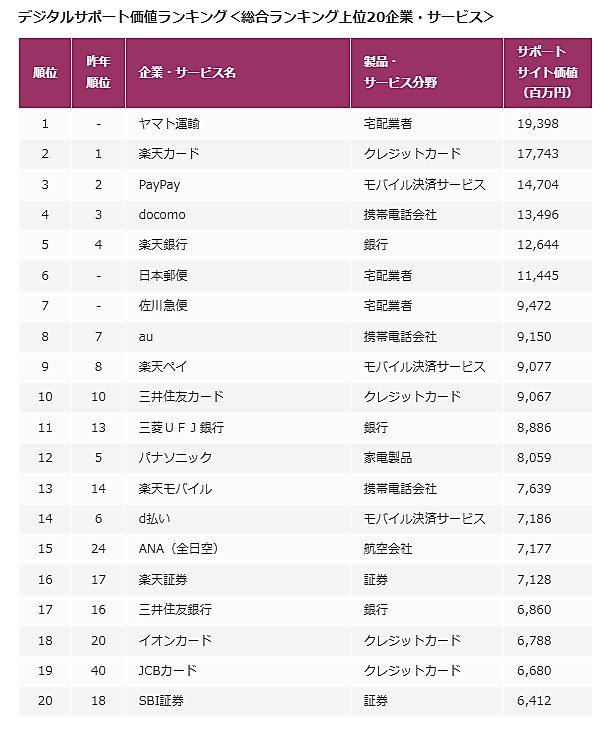 その結果、あらたに追加された「宅配業者」分野から多数が上位にランクイン。前年1位の「楽天カード」を抜き、「ヤマト運輸」がサポートサイト価値193億9800万円で1位となった。ヤマト運輸は、企業サイト、公式アプリ、LINE公式アカウントとさまざまなデジタルツールを用いて、利便性が高いサービスを提供している点が評価されている。