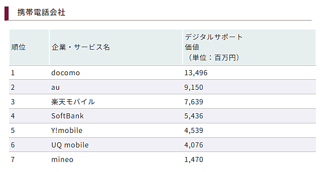 「クレジットカード」「モバイル決済サービス」「証券」「携帯電話会社(通信キャリア)」のランキング上位およびそのサポートサイト価値は、以下のとおり。
