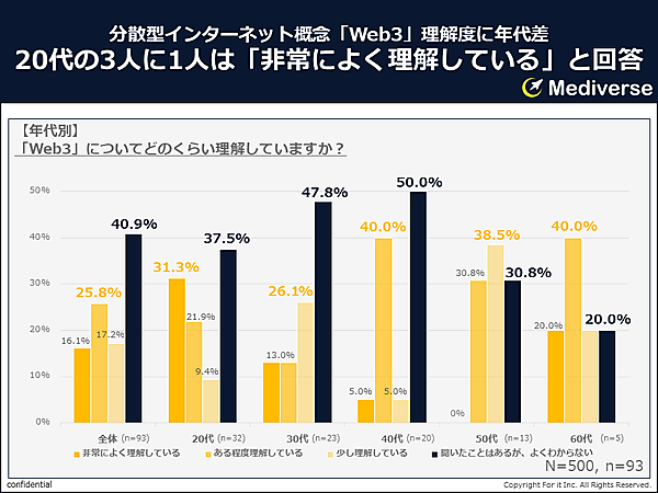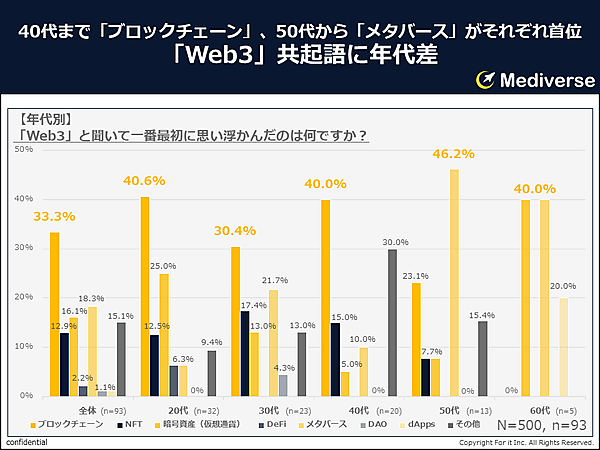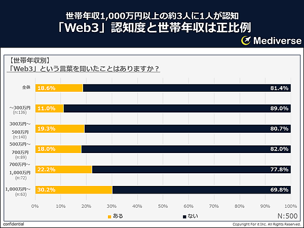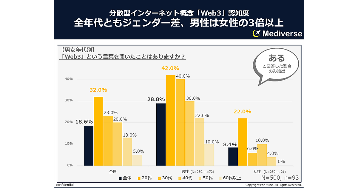 フォーイットが運営するWeb3メディア「Mediverse(メディバース)」は、「Web3」に関する調査結果を発表した。20歳以上の男女500人が回答している