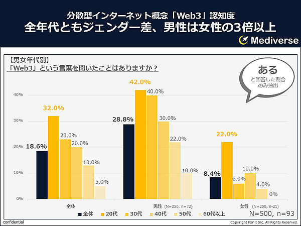 まず「Web3という言葉を聞いたことがあるか」と聞くと、「ある」は18.6%とかなり低い。男女年代別で見ると、「20代男性」の認知は42.0%で“男性は女性の3倍以上認知”していた。