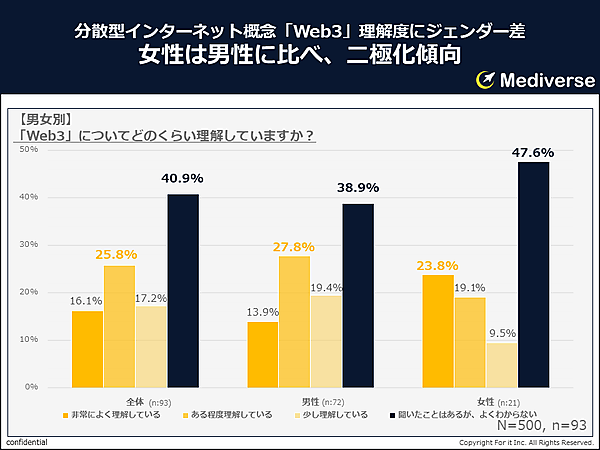 また男女別で「Web3」理解度を見ると、女性は「非常によく理解している」と「聞いたことはあるが、よくわからない」の回答比率が二極化している。