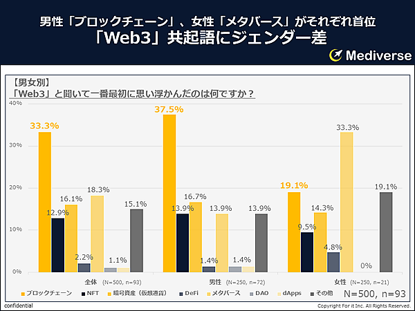 「Web3」を認知しているという93人(18.6%)に対して、「Web3と聞いて思い浮かぶこと(共起語/サジェストキーワード)」を聞くと、1位は「ブロックチェーン」33.3%で、2位「メタバース」18.3%、3位「暗号資産(仮想通貨)」がそれに続いた。なお男女別に見ると男性の37.5%が「ブロックチェーン」をあげた一方、女性の33.3%は「メタバース」をあげるなど男女差が目立った。