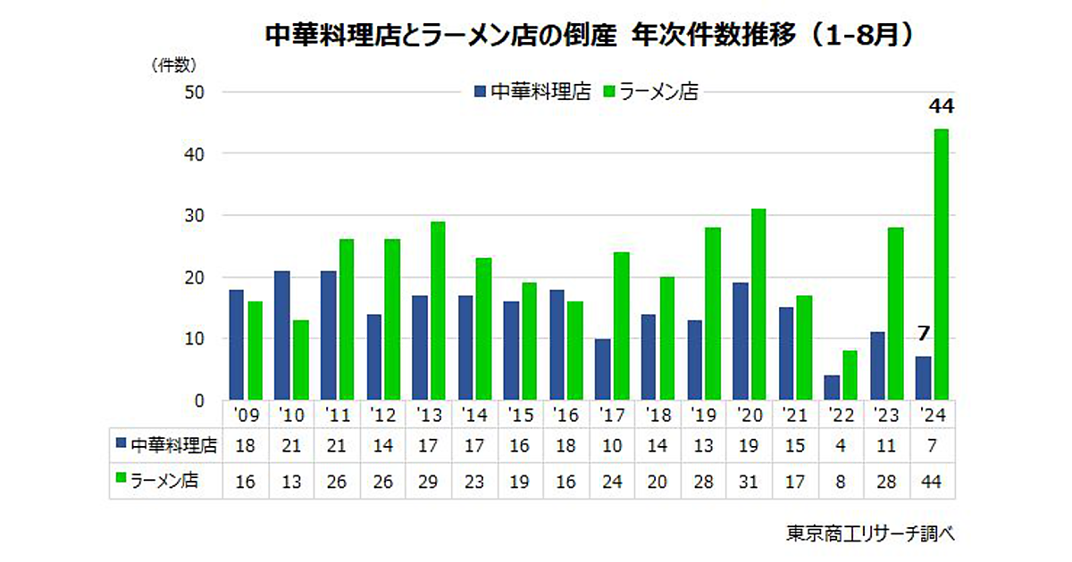 東京商工リサーチ(TSR)は、2024年1-8月のラーメン店・中華料理店の倒産件数について調べた。