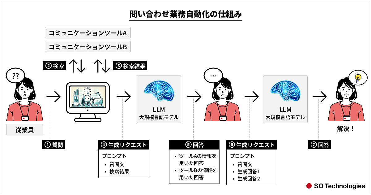 ビジネスチャットツール「Slack」の社内プラットフォームに寄せられた契約・取引、受発注、経理、総務領域の質問に対して、自動生成された回答と参考情報ページのURLを即時提供する。複数の情報源を活用して回答の質を向上する仕組みを設計し、「ChatGPT(GPT-4o)」と、大規模言語モデル(LLM)と外部データを効率的に接続するオープンソースライブラリの「LlamaIndex」を利用して構築した。
