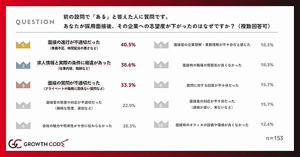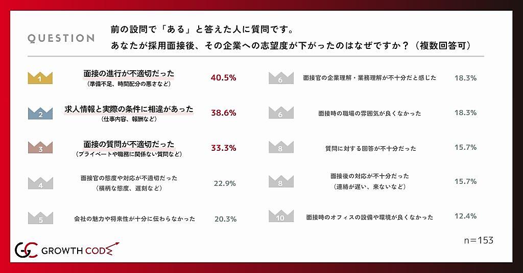 次に「面接をきっかけに志望度が下がった経験がある」と答えた153人にその理由を聞くと、「面接の進行が不適切だった」40.5%が最多。以下「求人情報と実際の条件に相違があった」38.6%、「面接の質問が不適切だった」33.3%が続く。