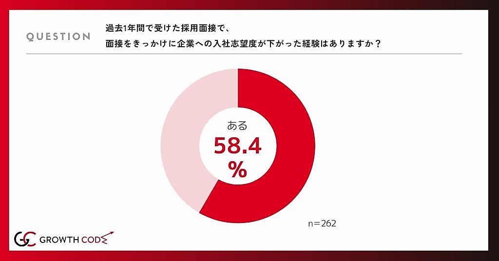 まず「過去1年間で受けた採用面接で、面接をきっかけに企業への入社志望度が下がった経験はありますか?」と聞くと、約6割(58.4%)が「下がった経験がある」と回答した。