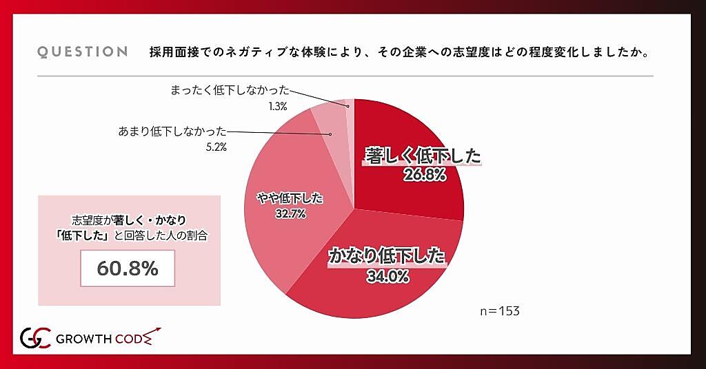 さらに「面接でのネガティブな体験が、その企業への志望度がどの程度変化しましたか」と聞くと、「著しく低下した」26.8%、「かなり低下した」34.0%など、6割超の人が大幅に志望度が低下していた。「やや低下した」も32.7%にのぼる。