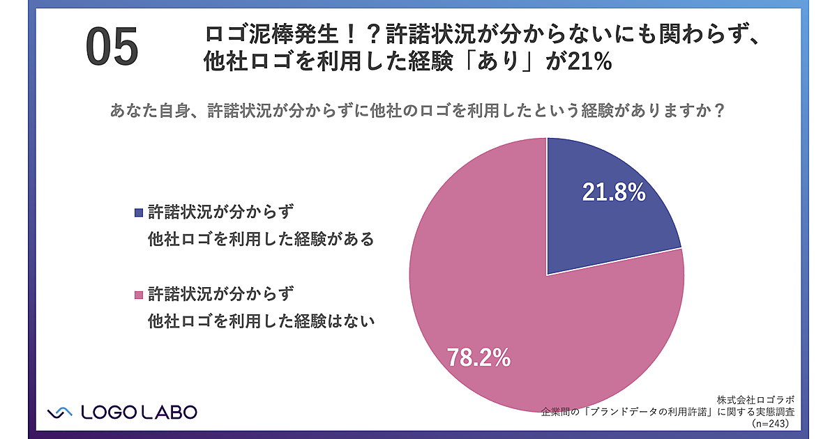 さらに、他社ロゴを利用する際、許諾状況がわからないまま無断で使用した経験があるかを聞くと、21.8%の人が「ある」と回答。適切な許諾がない状態で他社のロゴを勝手に利用してしまっている人が多いことがうかがえた。