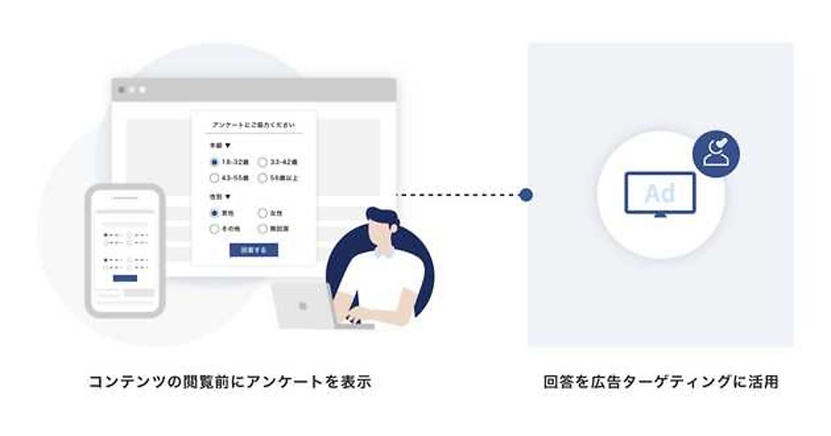 個人情報保護の規制強化でCookieを用いたトラッキングやターゲティング広告の精度が低下してメディア収益が減少する影響が出ており、特にログイン情報を持たないアノニマス(匿名)ユーザーへのパーソナライズされた広告配信が難しくなっている。このためユーザーから得たアンケート結果を効率良く広告配信に活用するシステムを提供し、広告ターゲティングの精度向上とマネタイズの促進を実現する。