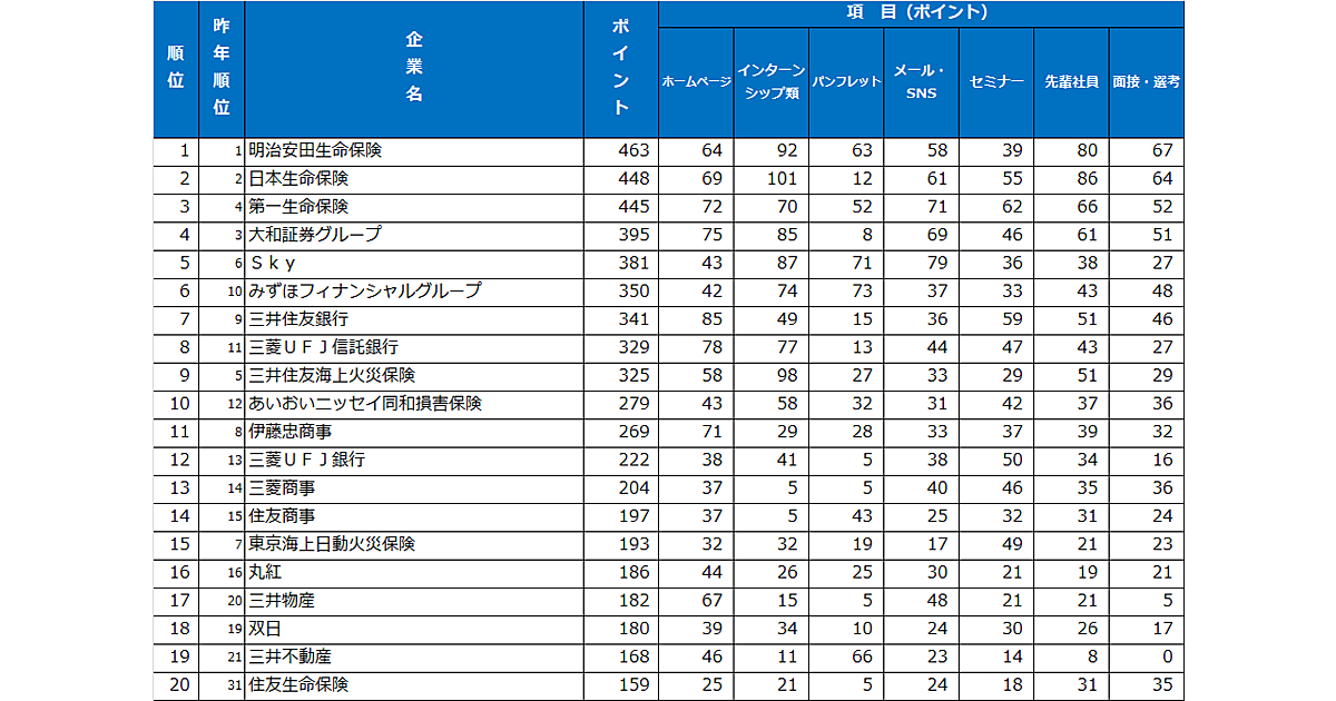 新卒採用力ランキング、1位は2年連続で「明治安田生命保険」