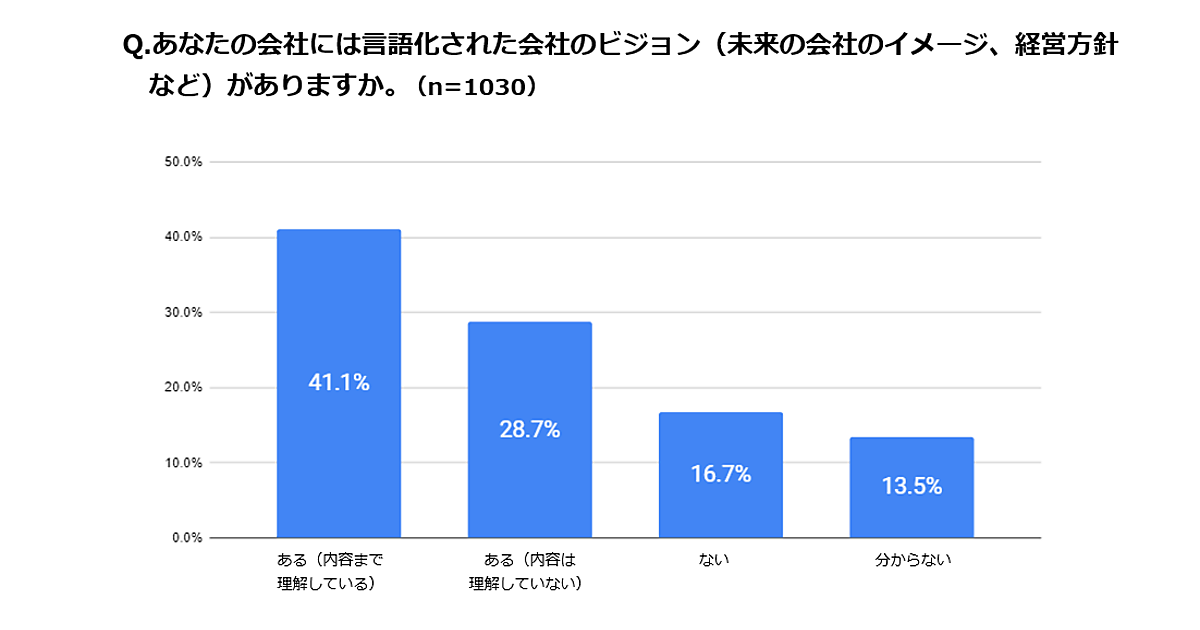 まず「自身が所属する会社にはビジョンがあるか」と聞くと、「ある(内容まで理解している)」41.1%、「ある(内容までは理解していない)」28.7%で、計69.8%が「会社のビジョンがある」と回答した。