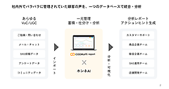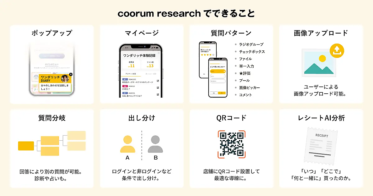 顧客が直感的に体験を記録する仕組みを設置。ポップアップ、顧客が記録できるマイページ、さまざまな質問パターン、画像アップロード、質問の分岐、出し分け、QRコード、レシートのAI(人工知能)解析の機能が活用可能で、従来の市場調査では時間とコストがかかっていた調査を容易に手間なく実施したり、顧客の本音を収集したりできるようになる。