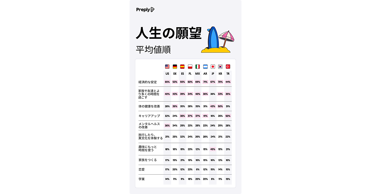 まず「人生の願望」について聞くと、すべての地域で「経済的な安定」が最多。平均61%、最多のアルゼンチンは71%に達する。メキシコ、韓国、日本もほぼ並ぶ。日本ではミレニアル世代の64%が、Z世代の59%を上回った。