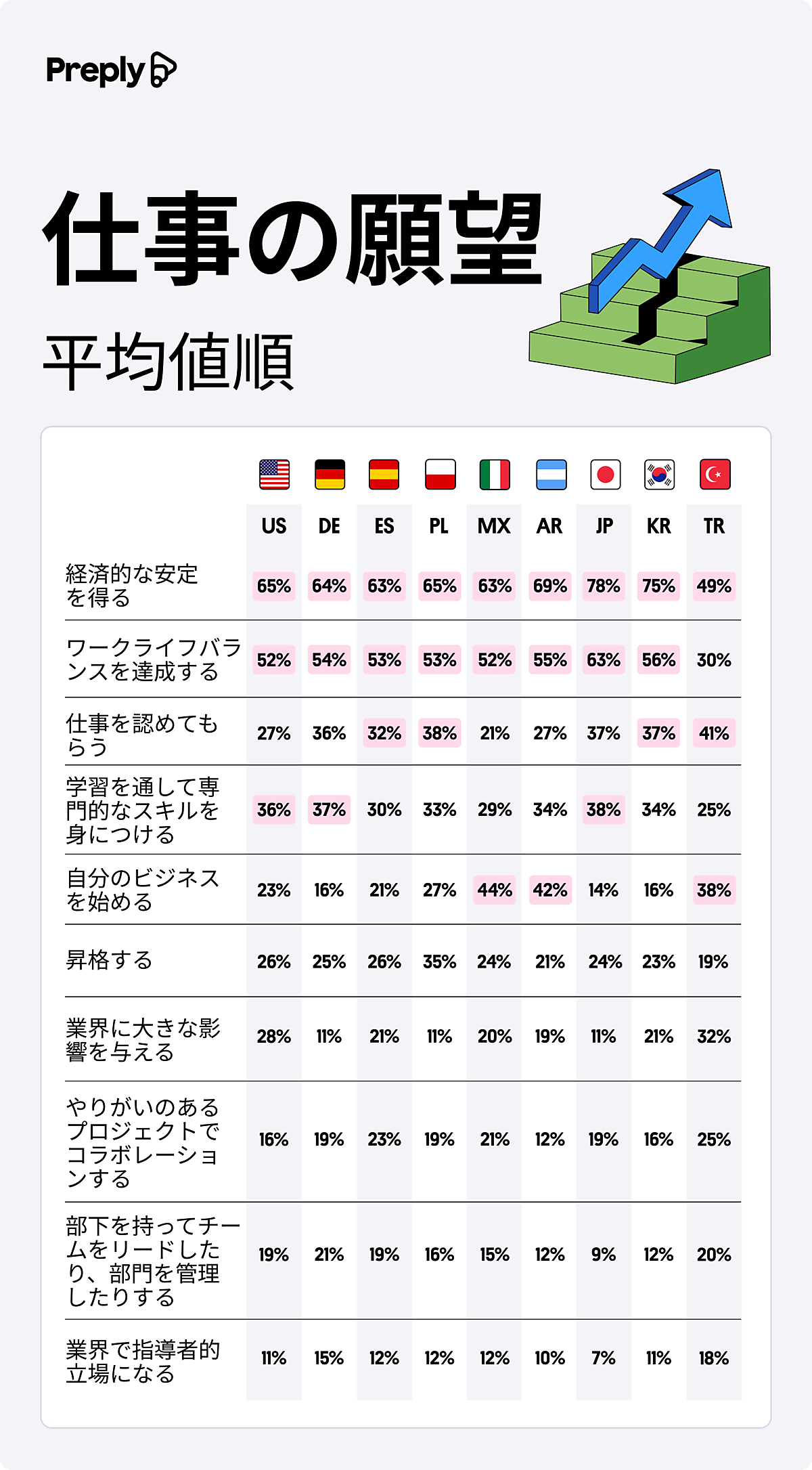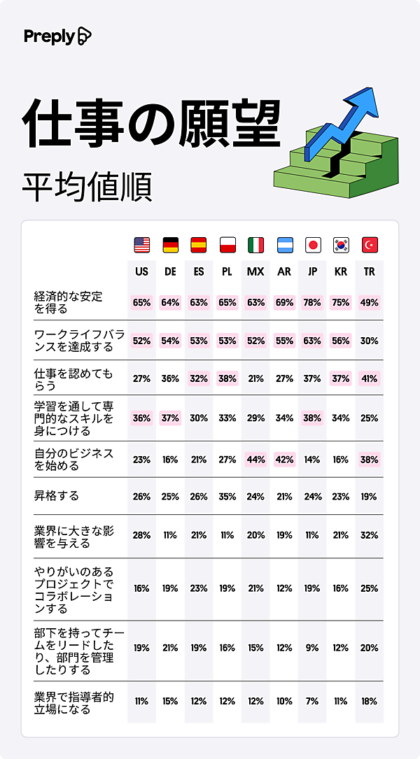 アメリカ、ドイツ、日本ではスキルアップや学習の機会を重視する傾向が強く見られた一方、アルゼンチン、メキシコ、トルコでは、約4割が「自分のビジネスを始めたい」と起業への意欲をあげた。