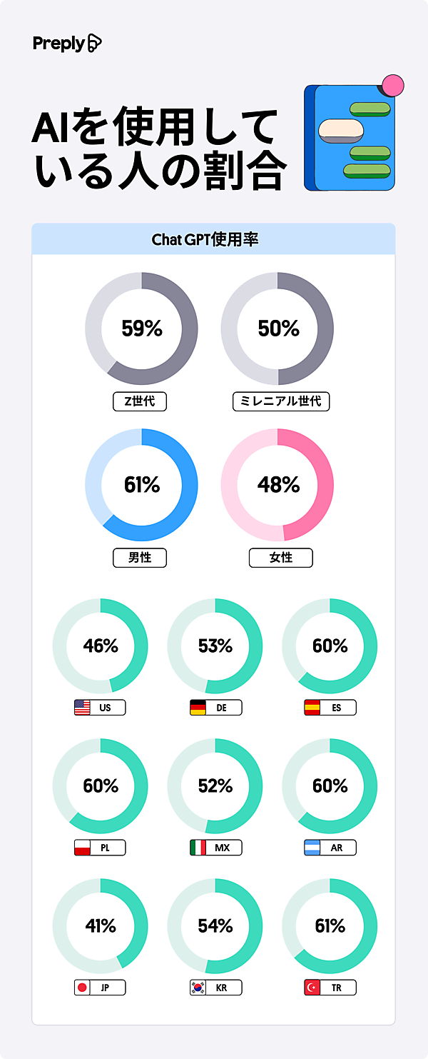 オンライン語学学習プラットフォーム「Preply(プレプリー)」は、「世界の若者のAI活用」に関する調査結果を発表した。世界(アメリカ、ドイツ、スペイン、ポーランド、メキシコ、アルゼンチン、日本、韓国、トルコ)の9地域5,400人が対象。性別(男性2677人、女性2695人)と世代(18歳~29歳:Z世代2651人、30~43歳:ミレニアル世代2750人)に分けられる