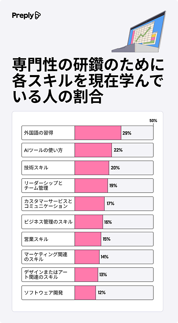 「専門性の研鑽のために学んでいるスキル」では、「外国語の習得」29%が最多。2位は「AIツールの使い方」22%で実験的な習得に励んでいる人も多そうだ。以下「技術スキル」20%、「リーダーシップとチーム管理」19%、「カスタマーサービスとコミュニケーション」17%など業務目的も多かった。