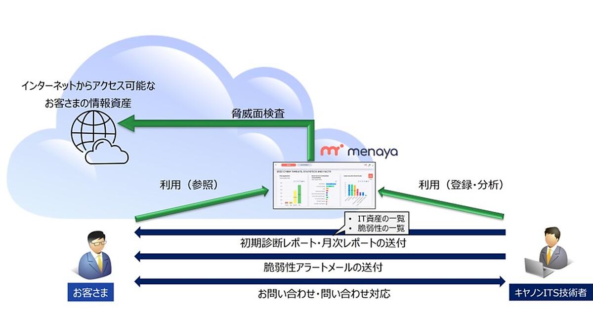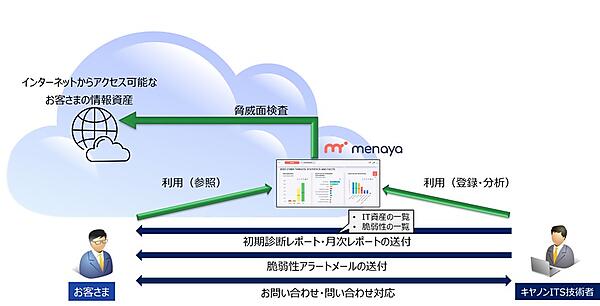 キヤノンITSの技術者がASMツールを設定し、インターネット側から継続して診断する。企業はツールの習熟・設定が不要で、レポートを受け取って結果を確認するだけですむ。確認方法は報告会で解説する。見付かった公開状態になっているIT資産をスコアリングして危険度を明確にし、対策の優先度や脆弱性診断の要否判断情報を提供する。月額6万2000円(税別)から。