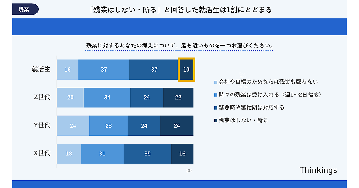 採用管理システム「sonar ATS」を展開するThinkings(シンキングス)は、「働き方」に関する調査結果を発表した。就活生100人と社会人300人が回答している。社会人はZ世代:1997~2005年生まれ、Y世代:1981~1996年生まれ、X世代:1965~1980年生まれで区分した。