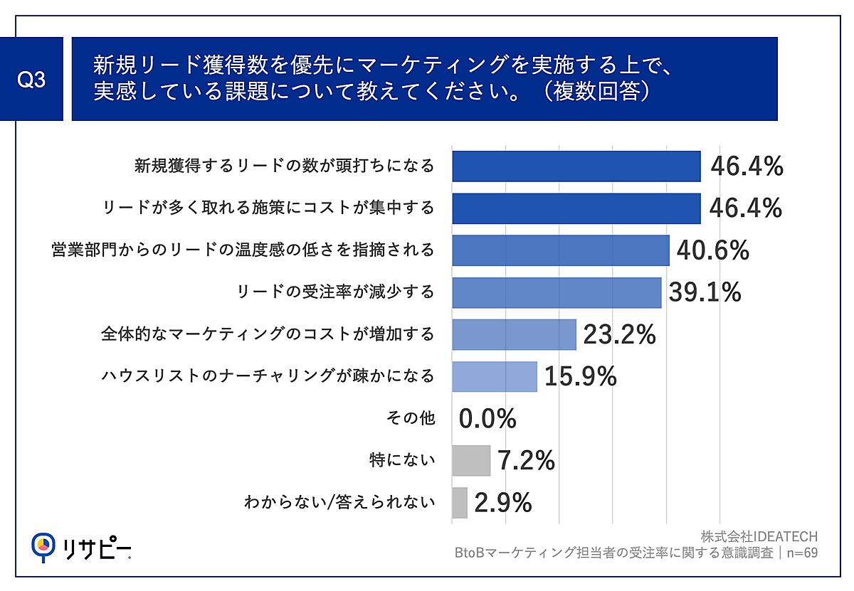 さらに「新規リード獲得数を優先にマーケティングを実施する上で、実感している課題」を聞くと、「新規獲得するリードの数が頭打ちになる」「リードが多く取れる施策にコストが集中する」が同率46.4%でトップ。「営業部門からリードの温度感の低さを指摘される」40.6%が僅差で続いた。