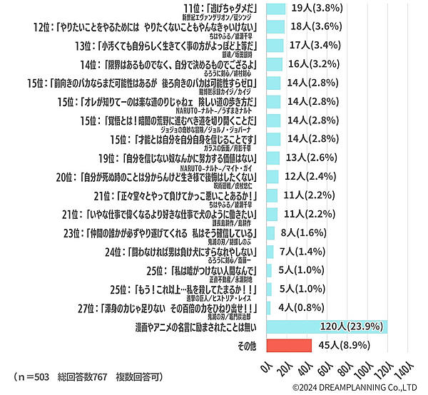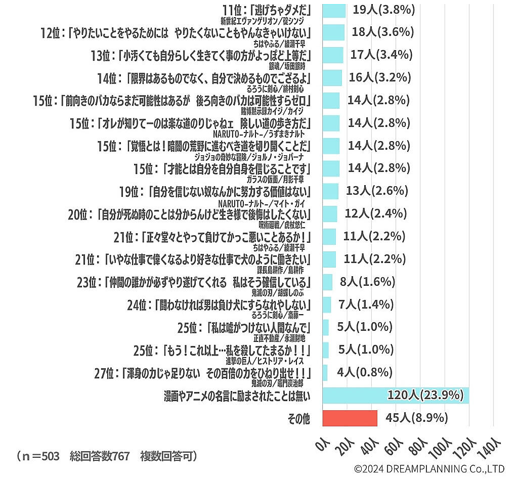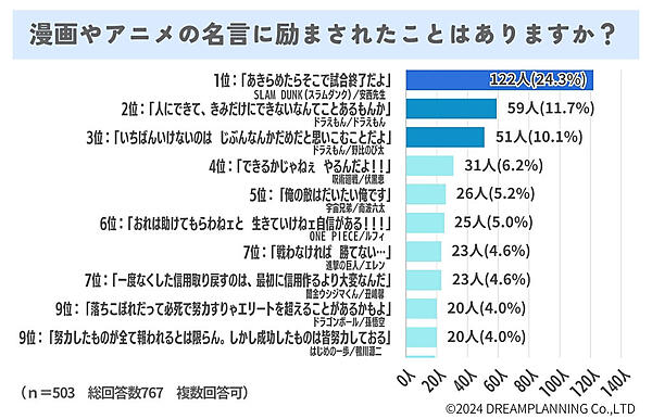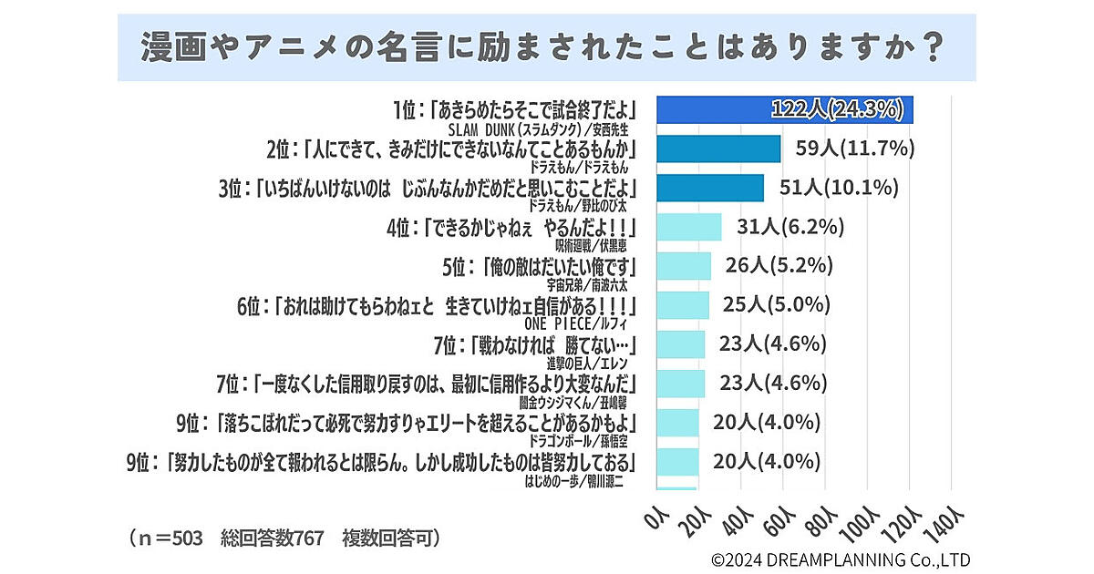 「漫画やアニメの名言に励まされたことはありますか?」と503人に聞いたところ、複数回答可のため767件の回答が寄せられた。そのうち圧倒的多数である122人の票を集めて1位になったのは、『SLAM DUNK(スラムダンク)』から安西先生の「あきらめたらそこで試合終了だよ」24.3%だった。