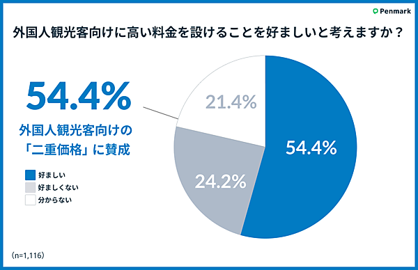一方で、「外国人観光客向けに高い料金を設けることについてどう思うか」と聞くと、「好ましい」54.4%と過半数が肯定的だった。