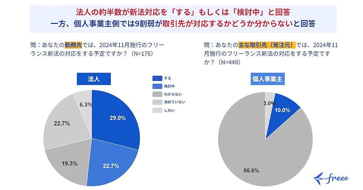 また、新法への対応について、法人では約半数が「対応する」もしくは「検討中」と回答した一方で、個人事業主では9割弱が「取引先が対応するかどうかわからない」と答えた。