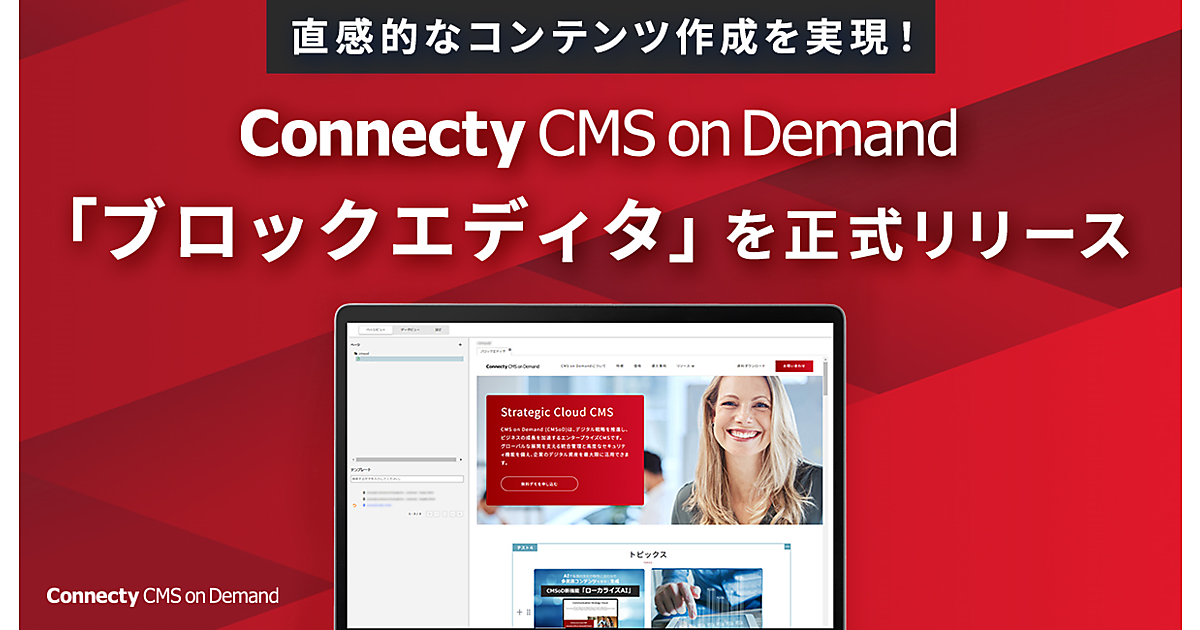 CMS(コンテンツ管理システム)とCDP(顧客データ基盤)開発・提供のコネクティは、大企業向けクラウドCMS「Connecty CMS on Demand(CMSoD)」の新機能「ブロックエディタ」の提供を始めたと10月16日に発表した。編集領域内にブロックを追加して編集・削除・並べ替えが簡単にできる直感的な操作性のコンテンツエディタで、より簡単に魅力的なコンテンツを作成でき、ユーザーのコンテンツ作成体験を革新する。