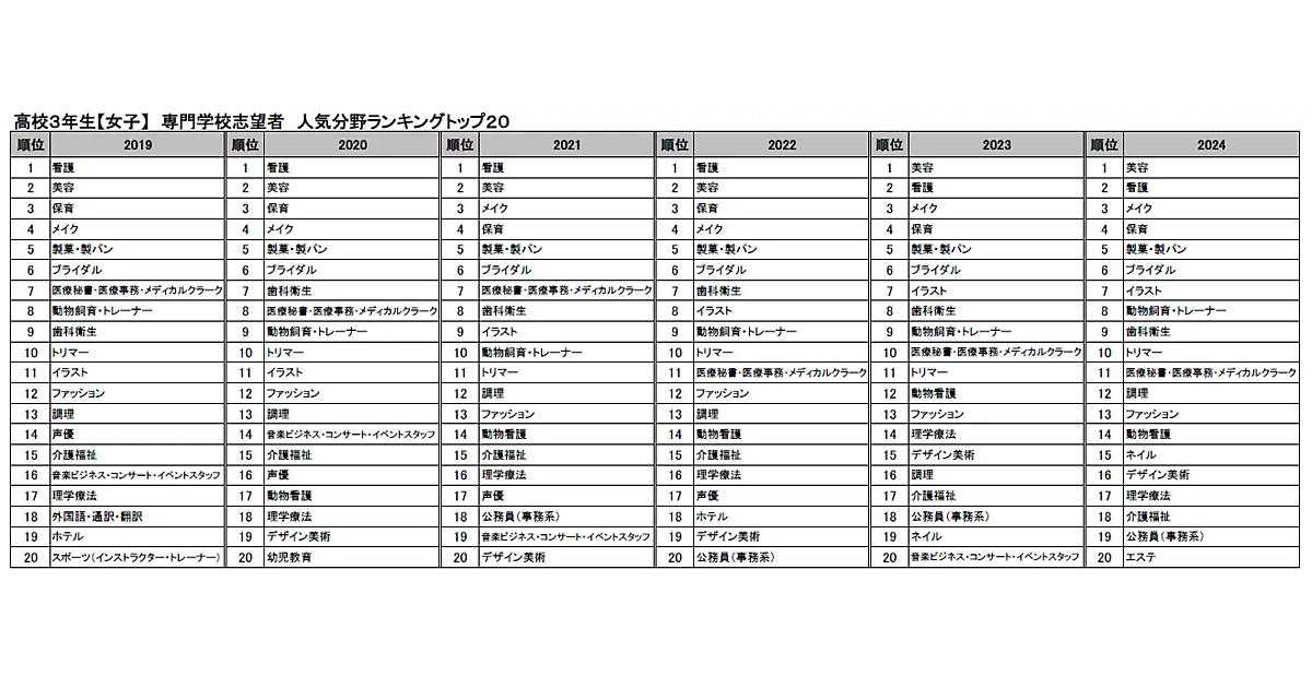女子では、長年不動の1位であった「看護」が2023年から2位に順位を下げ、「美容」がトップに。3位は「メイク」、4位は「保育」と続いている。コロナ禍での厳しい就労状況を受け、女子の「看護」「保育」「介護福祉」の志望者は年々減少傾向にある。また、同じくコロナ禍でダメージを受けた「観光・旅行」は、男子では回復基調にあるが、女子では緩やかな下降が続いている。