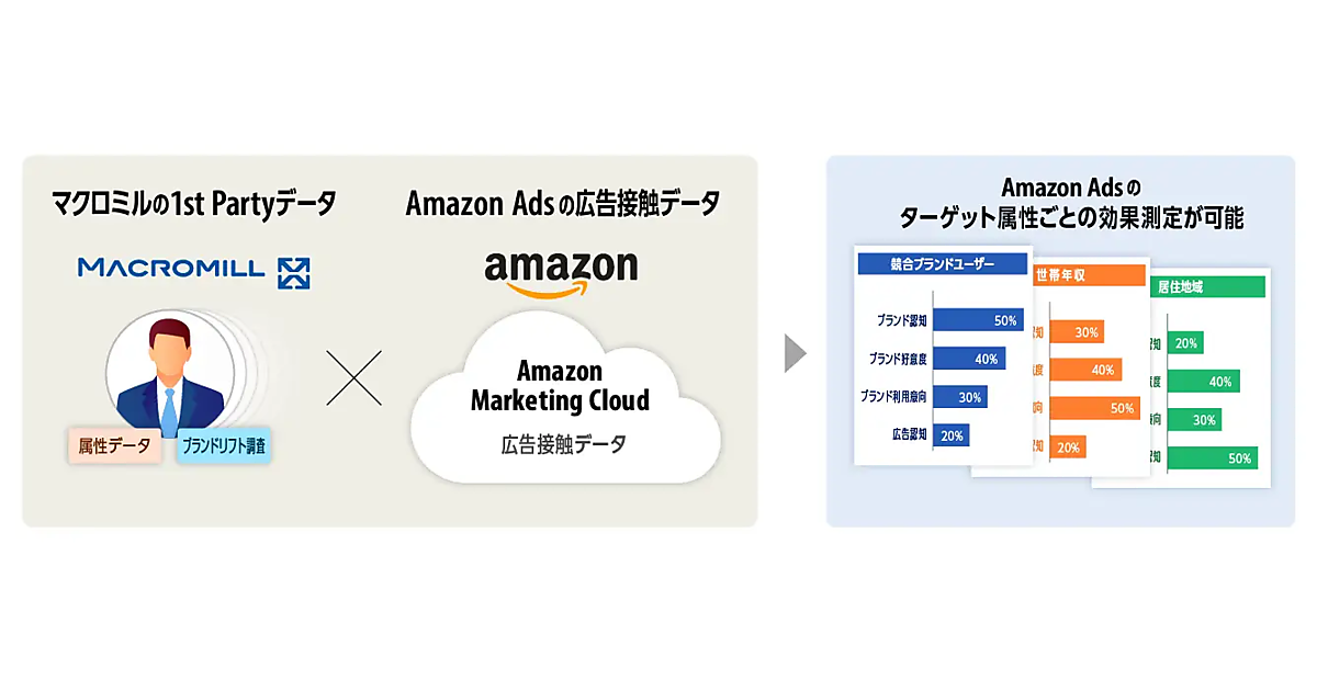 マーケティングリサーチ事業のマクロミルは、Amazon広告サービス「Amazon Ads」の認定パートナーとして広告の配信支援ソリューションと効果測定ソリューションの提供を10月16日に始めたと発表した。データクリーンルーム環境の「Amazon Marketing Cloud(AMC)」を活用し、独自に構築した国内最大規模130万人の自社パネルから得られる消費者データを用いて、Amazon Adsの拡張的な配信支援と効果測定ができる。