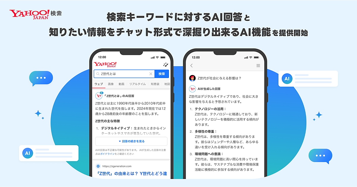 LINEヤフーは、「Yahoo!検索」で検索結果上に生成AI(人工知能)による回答の表示と、チャット形式で深堀りできる機能の提供を始めたと10月17日に発表した。スマートフォンの「Yahoo! JAPAN」アプリ(iOS版、Android版)とブラウザー版「Yahoo! JAPAN」、「LINE」アプリでのWeb検索で表示される。ユーザーが求める情報により速くたどり着き、少ないステップで知りたいことをより深堀りできることを目的に開発した。