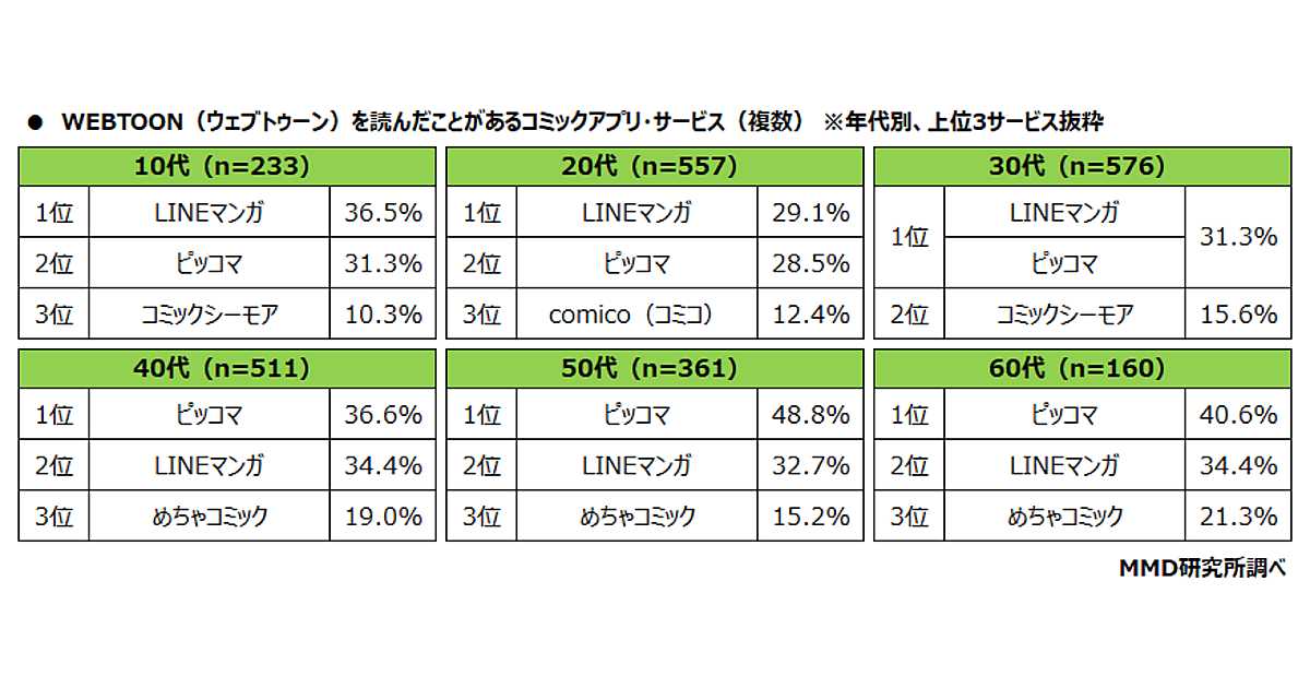 また、WEBTOON(ウェブトゥーン)を読んだことがあるコミックアプリ・サービスを聞くと、「ピッコマ」が35.0%で最も多く、以下「LINEマンガ」が32.4%、「めちゃコミック」が14.5%と続いた。年代別で見ると、10代~30代は「LINEマンガ」の割合が最も高く、40代~60代は「ピッコマ」の割合が最も高い結果となった。