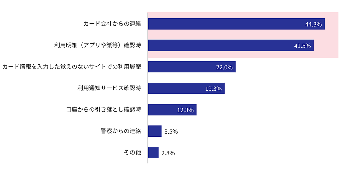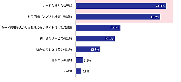 まず「どのようにクレジットカード不正利用が発覚しましたか?」を聞くと、「カード会社からの連絡」44.3%がもっとも多く、「利用明細の確認」41.5%をわずかに上回った。