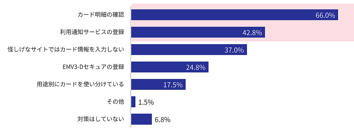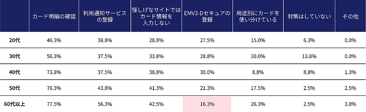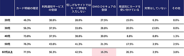 そこで「クレジットカードの不正利用に対する主要な対策」を聞くと、「カード明細の確認」66.0%が最多で、「利用通知サービスの登録」42.8%、「怪しげなサイトではカード情報を入力しない」37.0%といった対策が続いた。年代別で見ると、おおむね傾向は同じだが国が推奨している「EMV3-Dセキュアの登録」については、20~40代は約30%が登録している一方、60代以上はわずか16.3%にとどまった。
