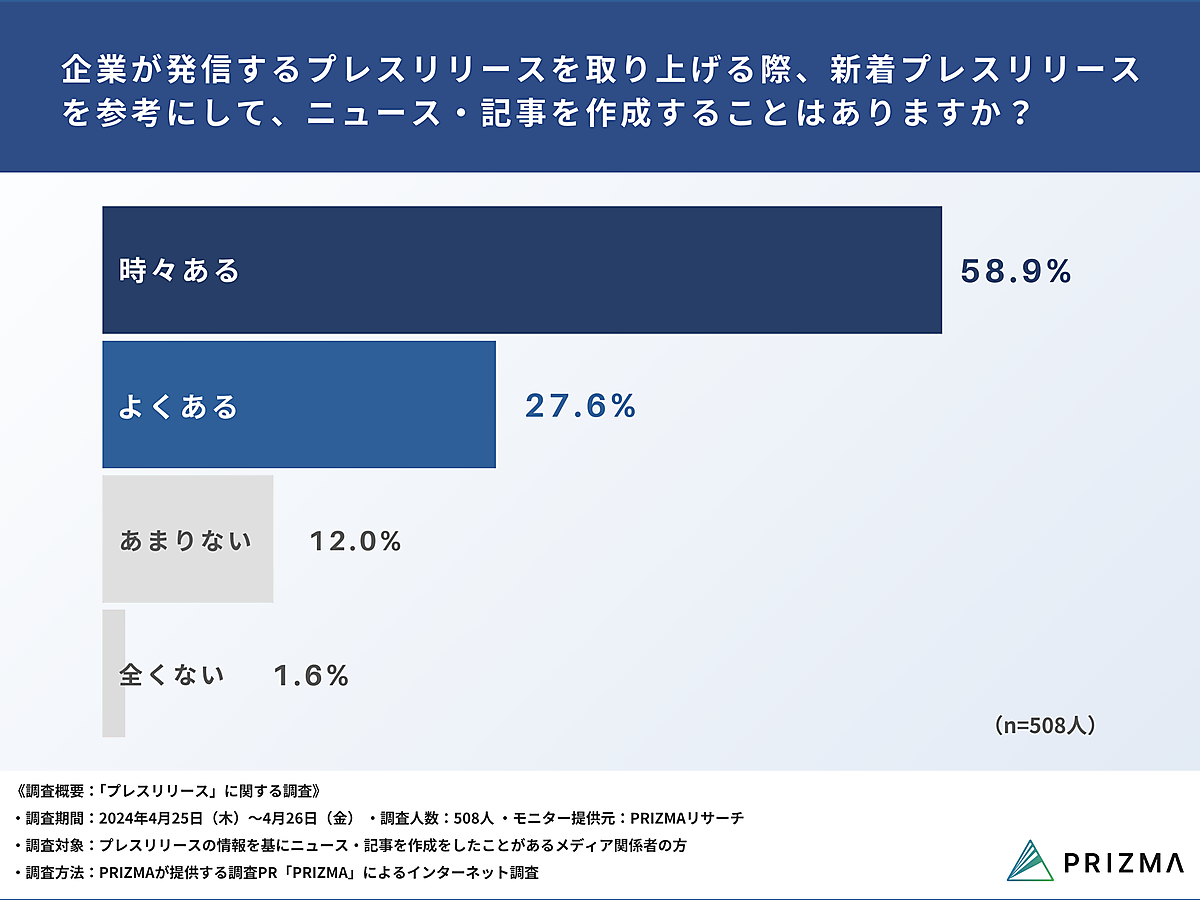 最後に「企業が発信するプレスリリースを取り上げる際、新着プレスリリースを参考にして、ニュース・記事を作成することはありますか?」と聞くと、「時々ある」58.9%、「よくある」27.6%で、8割超があると回答。「あまりない」は12.0%、「まったくない」は1.6%だった。