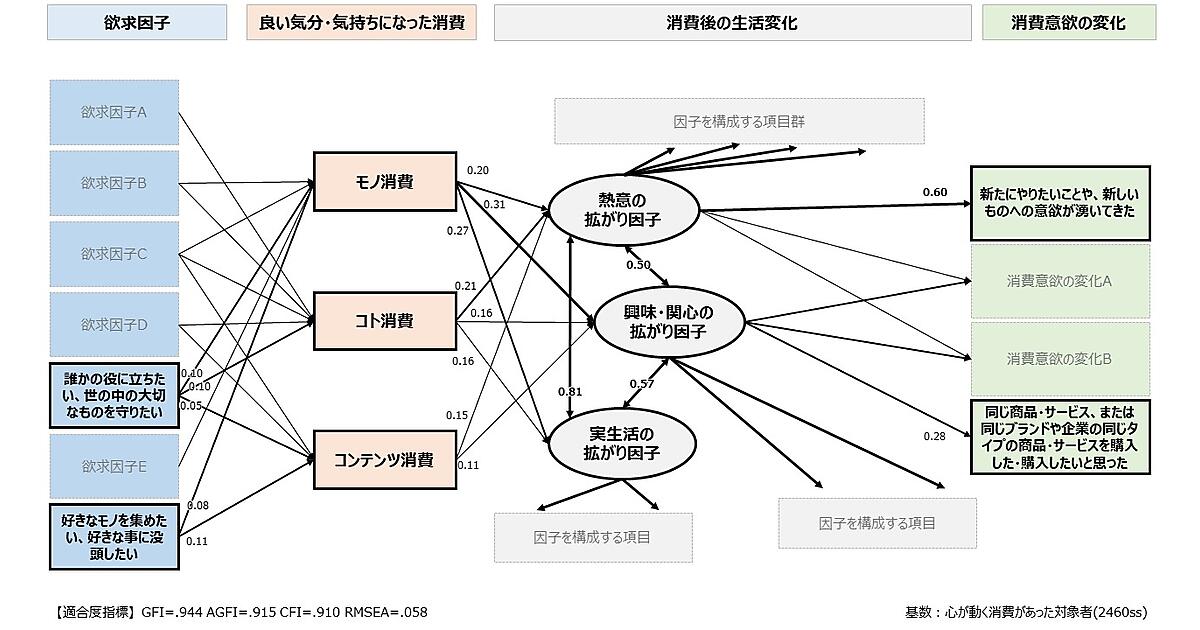 調査の共分散構造分析によって、どのような欲求が消費の好循環につながるのか、因果関係を明らかにした。共分散構造分析は、観測変数(アンケート調査や観測で得られたデータ)間の共分散(2つのデータの関係)の構造を分析する手法。潜在変数(直接観測できないものの観測データから推定されるデータ)を導入し、因果関係を分かりやすくモデル化する。