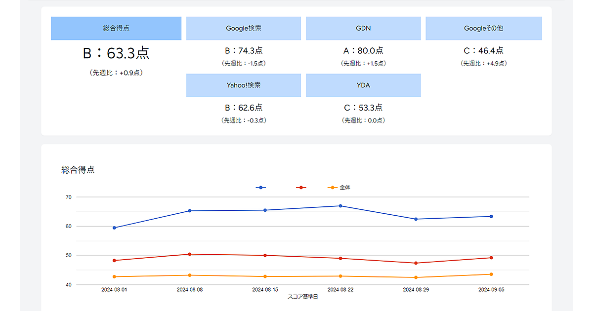 広告運用は複雑で細かいため、運用者によって品質がばらつきやすい課題がある。それを解決し、広告主に高い水準で安定したサービスを提供するために開発した。インターネット広告に25年以上関わってきたメディックスの経験や知見を集約し、独自の採点基準に反映した。運用者の経験に関係なく、高い基準で広告アカウントの改善箇所が分かる。