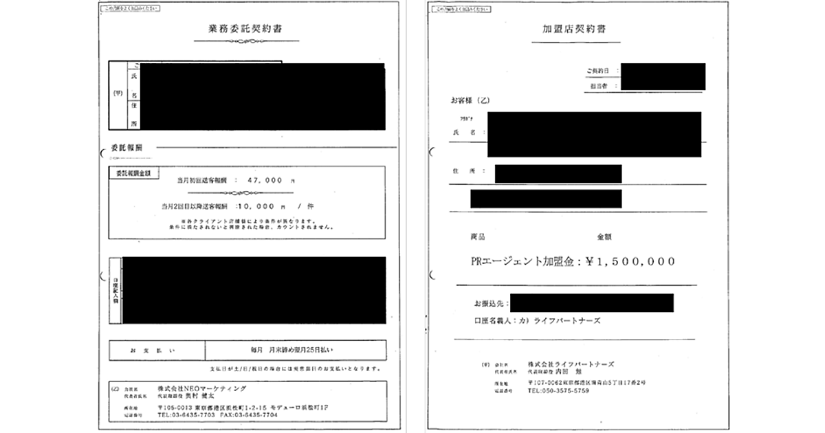 2社は、株式会社ライフパートナーズ(東京都港区南青山5-17-2、内田勉・代表)と株式会社NEOマーケティング(東京都渋谷区宇田川町36-3、奥村健太・代表)。美容系予約アプリや友人から、無料で施術してくれるエステサロンがあるという情報を得た消費者がサロンを予約して来店すると、店員に「月1万円がもらえる副業がある。やってみないか」と勧誘される。